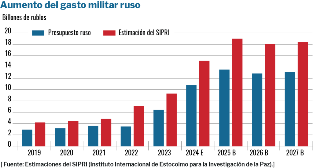 Este momento de euforia en el Kremlin se ha visto reflejado en el presupuesto para el próximo año. El gasto militar se llevará nada menos que el 41% del presupuesto del próximo año. En total, alcanzará el doble del presupuesto total destinado a partidas sociales, como las pensiones, prestaciones y ayudas públicas.