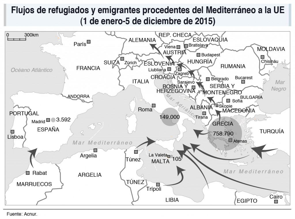 La Unión Europea está recibiendo un flujo continuado de inmigrantes y refugiados que se ha incrementado de forma significativa en 2015 debido a varios factores: