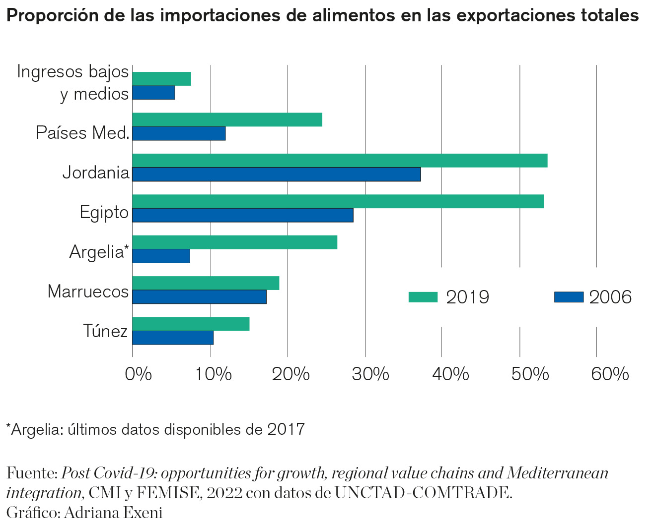Incluso antes del conflicto en Ucrania, la inseguridad alimentaria amenazaba a la orilla sur del Mediterráneo (op. cit), y a algunos países en particular. Aunque las importaciones de determinados productos agrícolas seguirán siendo necesarias, porque la autosuficiencia alimentaria no se presenta como un fin en sí misma, es cierto que una gran dependencia de las importaciones de los productos esenciales para la dieta y los hábitos de cada país crea importantes situaciones de vulnerabilidad que deben corregirse.