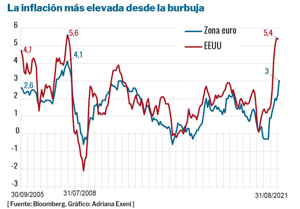 El repunte de la inflación hunde sus raíces en factores coyunturales, pero el riesgo de que tengan efectos estructurales es una preocupación creciente para los bancos centrales. Los registros de precios del mes de agosto muestran la mayor subida registrada en una década. En algunos bienes hay que remontarse incluso más atrás. Los datos amenazan con cambiar los planes de los “señores del dinero”. Los “halcones”, es decir, los más conservadores dentro de cada institución, comienzan a asustarse por el aumento de la inflación.