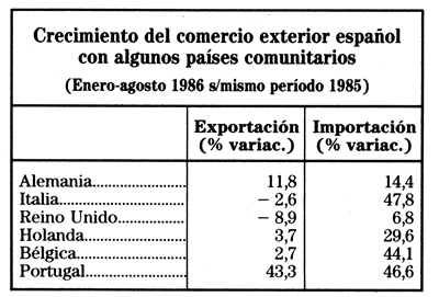En los últimos meses se está haciendo sentir el impacto de la aplicación del Tratado de Adhesión a la CEE en nuestro comercio exterior: Como se aprecia en el cuadro siguiente, las importaciones procedentes de bastantes países miembros del Mercado Común están creciendo con gran rapidez, mientras que nuestras exportaciones se estancan o crecen muy lentamente. No hay, por el momento, motivos para la preocupación, pero sí resulta de interés profundizar en las causas que determinan el proceso.