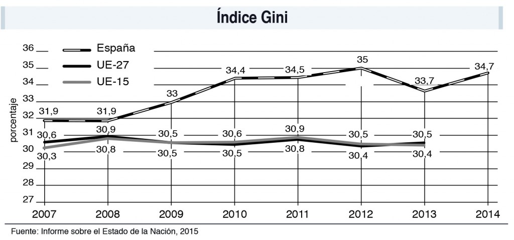 Tanto el Indicador 80/20 como el Índice Gini constatan que España está muy por encima de la media europea en desigualdad y que esta se ha incrementado de forma significativa durante la crisis, mientras no ha ocurrido así en el resto de los países de la Unión Europea.
