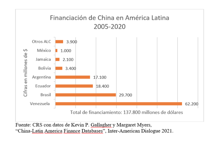 En el ámbito financiero, el gigante asiático se ha convertido en una fuente alternativa al mercado financiero privado y a los organismos de Bretton Woods. El Banco de Desarrollo de China y el Banco de Exportación e Importación de China se encuentran entre los principales financistas de la región. Entre 2005 y 2020, los préstamos acumulados ascendieron a más de 137.000 millones, siendo Venezuela, Brasil, Ecuador y Argentina los principales receptores, como muestra el gráfico. En cuanto a las inversiones de China en la región, estas ascendieron a 140.000 millones entre 2005 y 2021, de los cuales 64.000 millones corresponden a Brasil y 25.000 millones a Perú, según datos del Inter-American Dialogue.