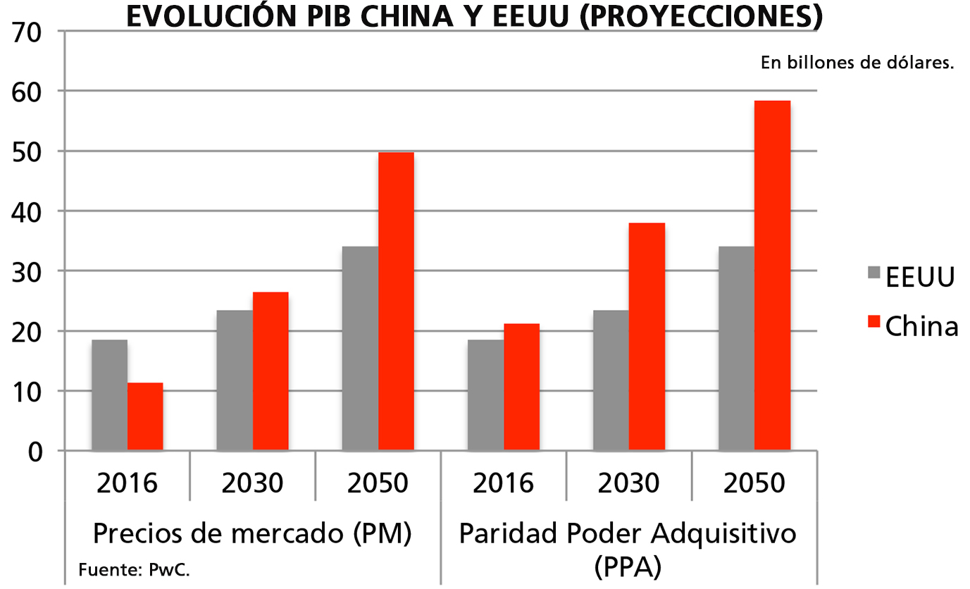 Según las proyecciones económicas para 2050, el PIB de China, a precios de mercado, será un 46% mayor que el de EEUU. ¿En qué medida la política económica de Donald Trump puede a ...