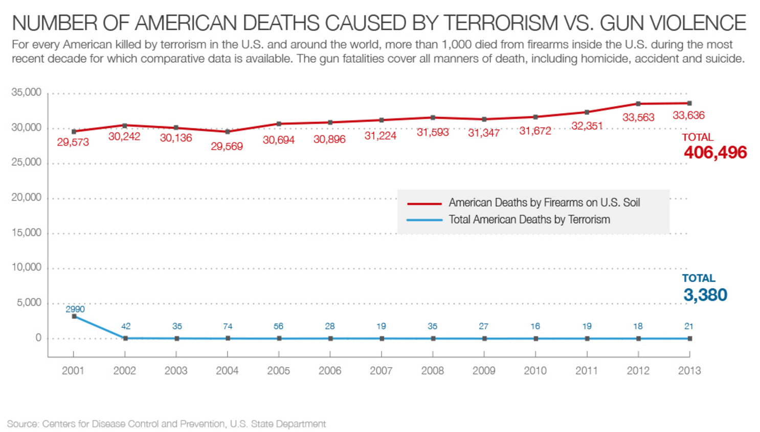 Gravísimo. En EE UU, más de 30.000 personas mueren cada año en incidentes relacionados con armas de fuego (tiroteos, accidentes, suicidios, etcétera). Como muestra esta gráfica de CNN, se trata de una cifra infinitamente mayor a la de americanos que mueren en atentados terroristas. Incluso en 2001 murieron diez veces más americanos por armas de fuego que en atentados terroristas: