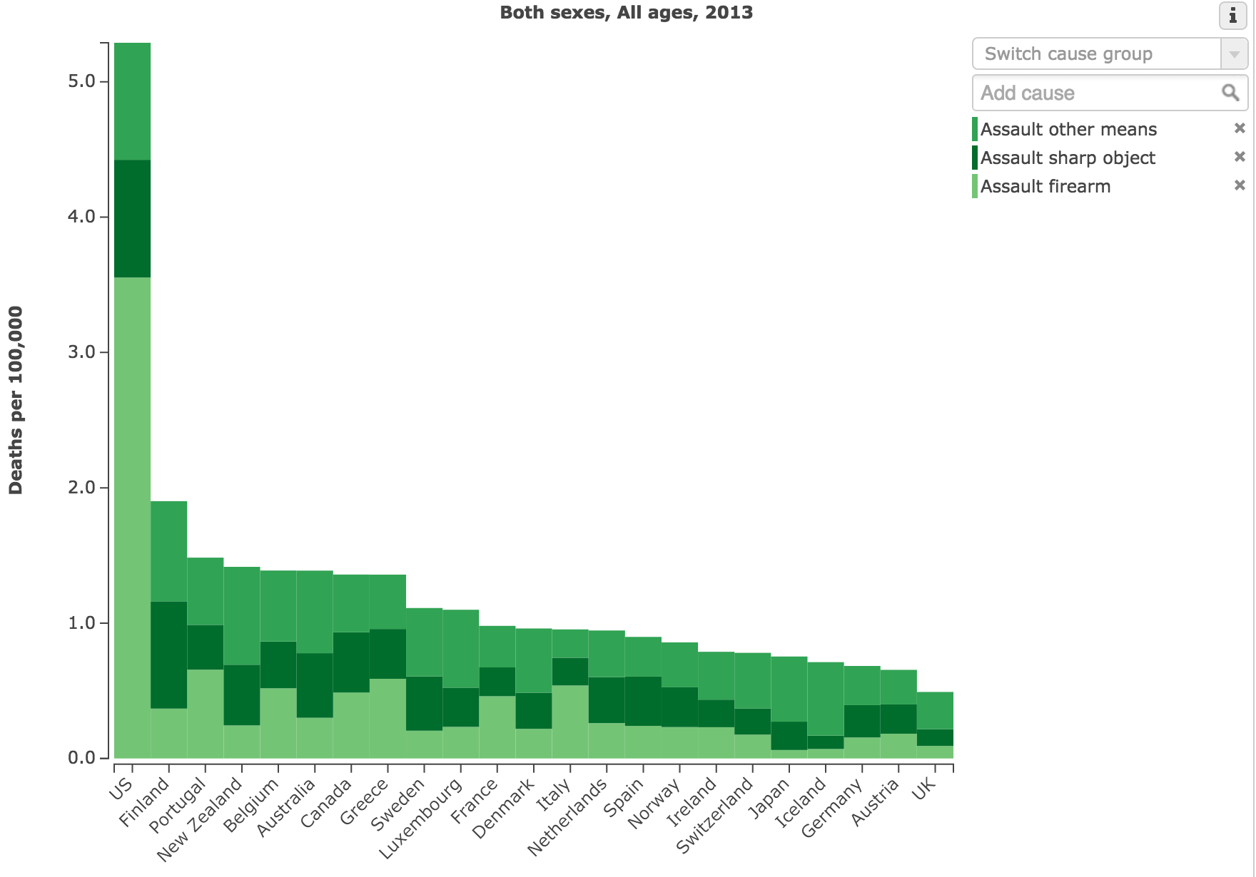 El caso de EE UU no es representativo. Aunque los índices de asesinato por otros medios, como apuñalamiento, son similares a los de países europeos, las muertes por armas de fuego (color verde claro en la gráfica elaborada por la Universidad de Washington) son muy superiores: