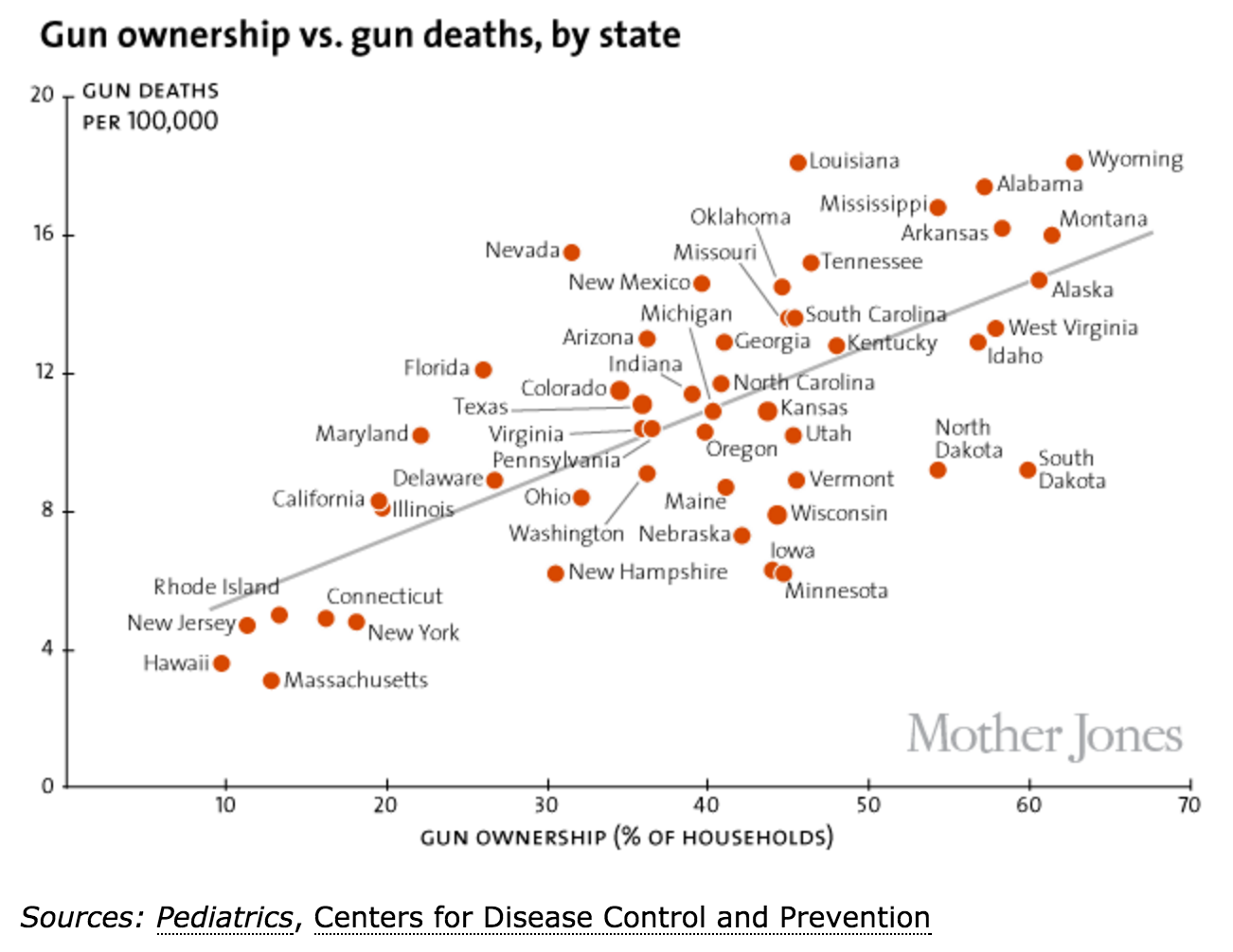 La cantidad de armas de fuego per cápita en EE UU, por tanto, es muy superior a la de cualquier otro país desarrollado. Y como muestra la revista Mother Jones en esta gráfica, existe una correlación indiscutible entre posesión de armas de fuego y muertes violentas: