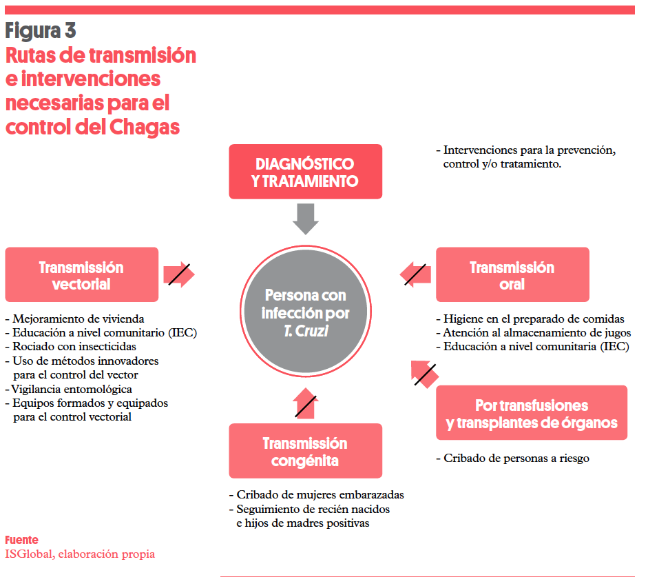 Esta enfermedad es causada por un parásito intracelular llamado T. Cruzi que es transmitido a los seres humanos y otros mamíferos por insectos vectores llamados vinchucas o chinches. Estos insectos colonizan viviendas precarias mal construidas de las zonas rurales, suburbanas y urbanas de América Latina. El T. Cruzi puede ser también transmitido a través de transfusiones o trasplantes, de manera vertical durante el embarazo y por ingestión de alimentos contaminados. Al no existir vacuna, es esencial el control del vector y las demás formas de transmisión.