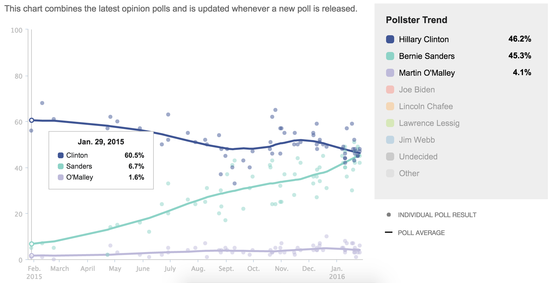 Las primarias de 2016, que se anticipaban aburridas por predecibles, están resultando excepcionalmente dinámicas. Hillary Clinton se anunciaba con un aura de inevitabilidad hace tan solo diez meses, pero hoy pierde terreno a la izquierda ante Bernie Sanders, el senador socialista por Vermont. El Iowa y New Hampshire, algunas encuestas pronostican un sorpasso de Sanders. De cara a los caucus, como muestra esta gráfica del Huffington Post, Sanders mantiene la inercia ante el desgaste de su rival. Dos derrotas pondrían a Clinton contra las cuerdas, aunque la ex secretaria de Estado aún aventaja a Sanders en el voto negro y latino, crítico de cara al súper martes.