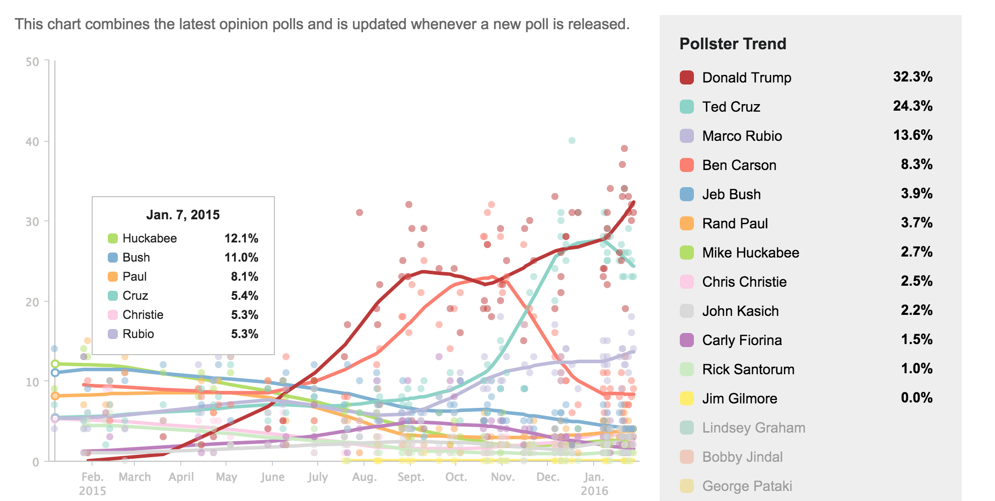 En el bando republicano, el favorito también era un candidato dinástico: Jeb Bush, hijo y hermano de presidentes. Igual que Clinton, Bush contaba con el apoyo de los pesos pesado de su partido y de sus donantes más potentes. Pero su falta de carisma y sus intervenciones mediocres en los debates televisados le han hecho caer ante candidatos populistas y xenófobos, como Donald Trump y Ted Cruz. Incluso el voto del establishment republicano parece decantarse por Marco Rubio, en detrimento de Bush, que fue su mentor político en Florida. Trump domina el conjunto de las primarias republicanas, con un 30% de intención de voto. Pero Cruz, que acumula meses cultivando el voto evangelista, está en condiciones de disputarle Iowa. Con ocho candidatos y tanto el voto populista como el más centrado divididos, las primarias republicanas se anuncian especialmente volátiles.