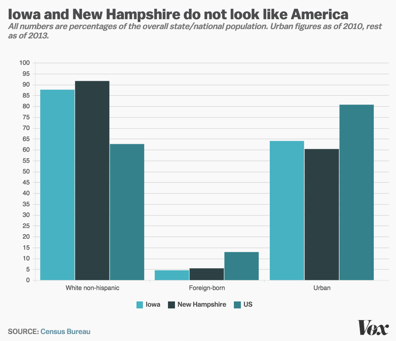 La designación de Iowa como avanzadilla electoral es polémica. Como indica esta gráfica de Vox, se trata de un estado poco representativo del conjunto del país, con una población más blanca y rural que la del resto de EE UU. El monocultivo de maíz por gran parte de sus agricultores se traduce en un sinfín de subvenciones insostenibles al etanol. Y la organización de los activistas evangélicos en el estado ha distorsionado las primarias republicanas, garantizando un arranque espectacular para los candidatos que apoyan a estos grupos, como Mike Huckabee en 2012.