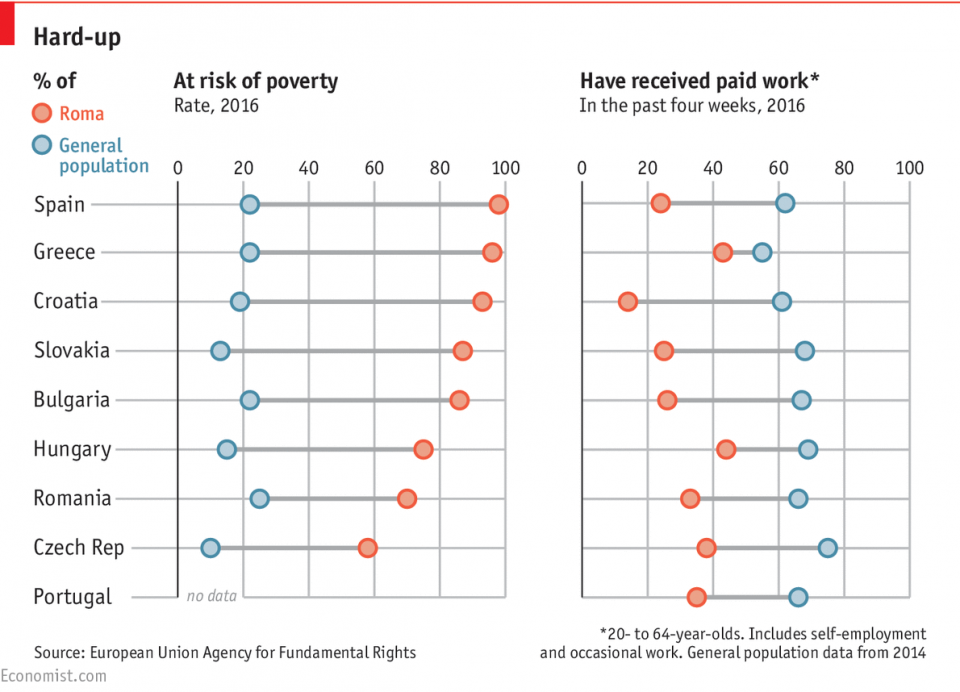 La alta especialización del mercado laboral se traduce en una escasa oferta de oportunidades para aquellos con baja y media cualificación. Las limitadas oportunidades dificultan que los romaníes trabajen de manera legal y los empuja a empleos inestables en el mercado negro. Esto los hace vulnerables a la explotación en empleos de bajos ingresos, ocasionales y de corta duración.