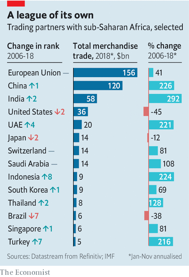 En 2006, EEUU, China y Francia eran, en ese orden, los tres primeros socios comerciales de África subsahariana. Pero entre ese año y 2018, sus intercambios comerciales con China aumentaron un 226%, con India un 292%, con Turquía un 216%, con Rusia un 335% y con Indonesia un 224%. El que mantiene con la Unión Europea, todavía su mayor socio comercial, subió solo un 41%. Con EEUU se redujo. En 2018, China ya era el principal socio comercial de África, seguido de India y EEUU. Francia hoy es el séptimo.
