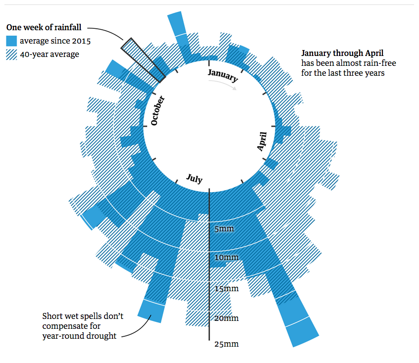 Enero, febrero y marzo suelen ser los meses más secos del año en la zona. Las lluvias no llegan hasta junio y duran por lo general hasta agosto. La alcaldesa de Ciudad el Cabo, Patricia De Lille, ha ordenado que cuando los niveles de los reservorios –que están en el 29% que tenían en 2014– bajen al 13,5%, el suministro municipal de agua sea cerrado salvo para servicios esenciales y los hospitales, a fin de prevenir una catástrofe sanitaria.