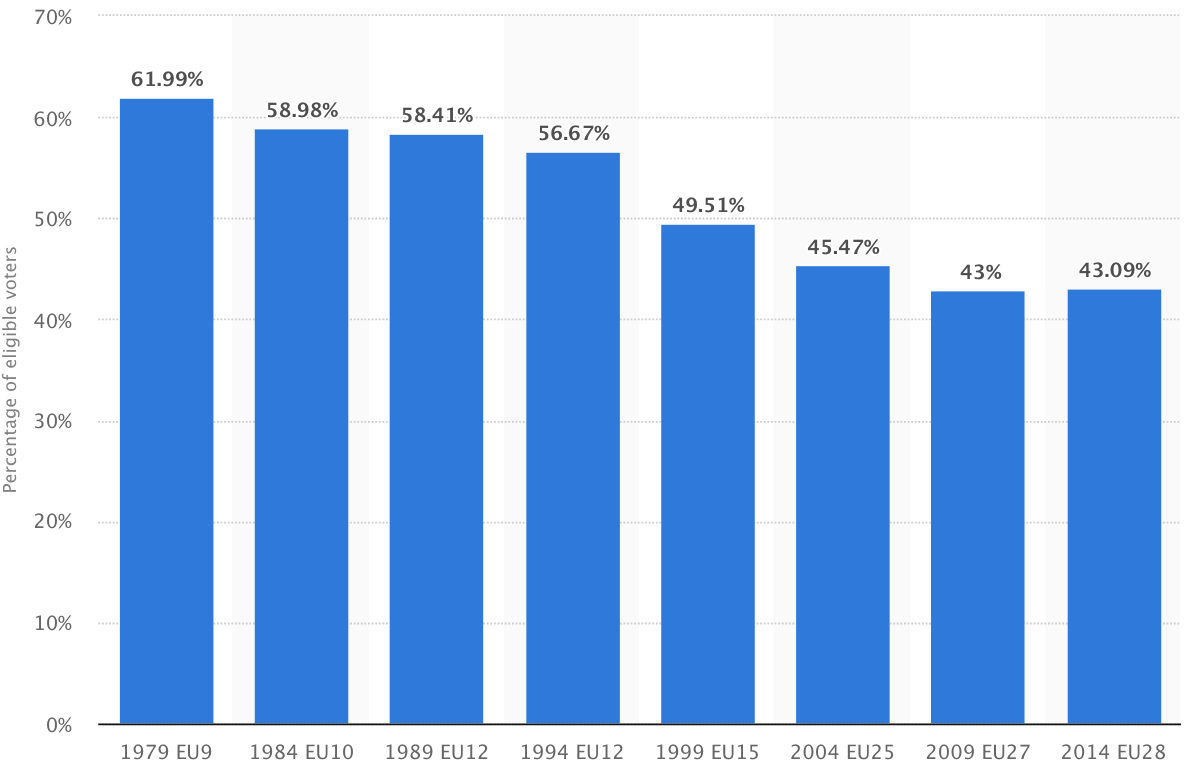 Participación en elecciones europeas, 1979-2014. Fuente: Statista.