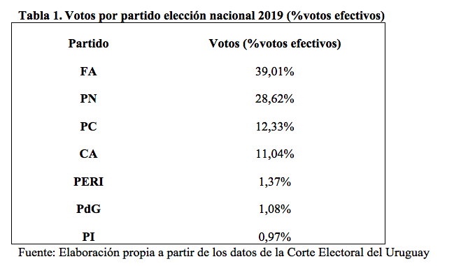 Si bien el FA es por quinta vez consecutiva el partido más votado y el PN es de nuevo segundo, todos los partidos con representación parlamentaria en el último ciclo perdieron votos. El FA estuvo cerca de su peor resultado en 20 años mientras que el PN pierde votos desde 2004. Y el Partido Colorado (PC) no logra repuntar, obteniendo el segundo peor resultado en sus 183 años de historia, a pesar de haber contado con una renovación considerable. Aunque en términos relativos el gran perdedor fue el Partido Independiente, que se desplomó al 0,97%, perdiendo su representación en el Senado además de casi toda su bancada de diputados.