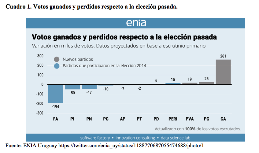¿Ganadores? Los debutantes y más radicales. El Partido Ecologista Radical Intransigente (PERI) logró entrar en el Parlamento y Cabildo Abierto (CA) fue el gran ganador, al irrumpir pisándole los talones al PC, obteniendo un 11%, debut electoral solo superado por la creación del FA en 1971 (18%). Se convierte así en un socio ineludible para cualquier mayoría parlamentaria que excluya al FA.