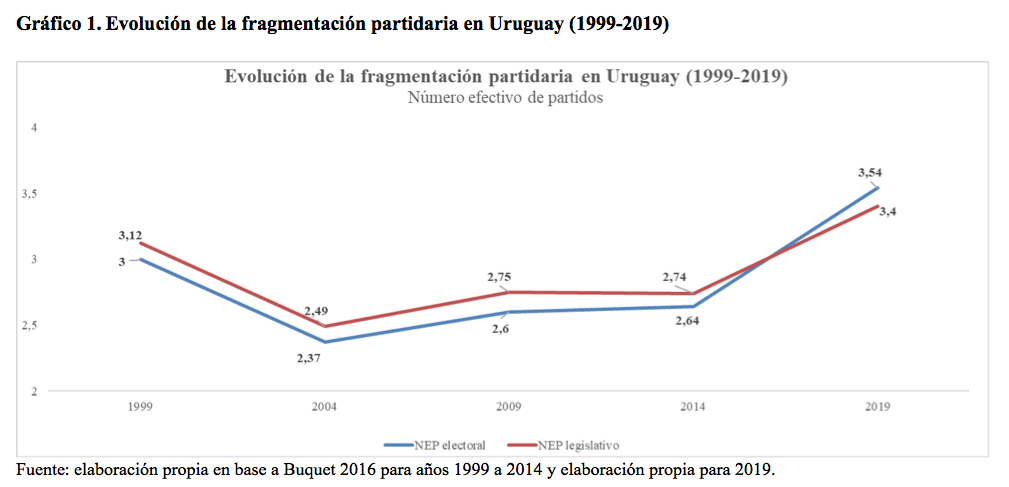 La diferencia fundamental con respecto a los ciclos anteriores es el aumento de la fragmentación en el sistema de partidos. La nueva legislatura tendrá un récord de siete partidos presentes en el Parlamento. Por tanto, la coalición “tradicional” debería ampliarse y necesariamente incluir a la sorpresa del ciclo: CA. Así, en caso de triunfar el PN, por primera vez en la historia la coalición mínima ganadora deberá tener al menos tres miembros. Tendríamos de ese modo dos sucesos inéditos: una gran coalición o un presidente de izquierda gobernando en minoría, ya que en el FA persiste el problema de no tener socios para una coalición preelectoral. Una victoria de Martínez pondría a prueba al sistema político debido a las declaraciones hechas por los líderes del PC y CA durante la campaña, que dijeron estar dispuestos a negociar antes que darle el gobierno al FA.