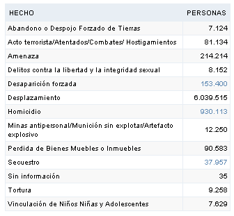 El país latinoamericano arrastra un largo historial de violencia y criminalidad. Persiste una prolongada crisis humanitaria, según apuntan diversas organizaciones internacionales, a pesar de las negociaciones de paz entre el gobierno y los grupos armados ilegales. La organización colombiana Red Nacional de Información (RNI) ofrece una tabla con el número de víctimas del conflicto armado desde sus inicios. Aunque RNI advierte que se trata datos orientativos, puesto que hay que tener en cuenta que muchas personas no denuncian por miedo.