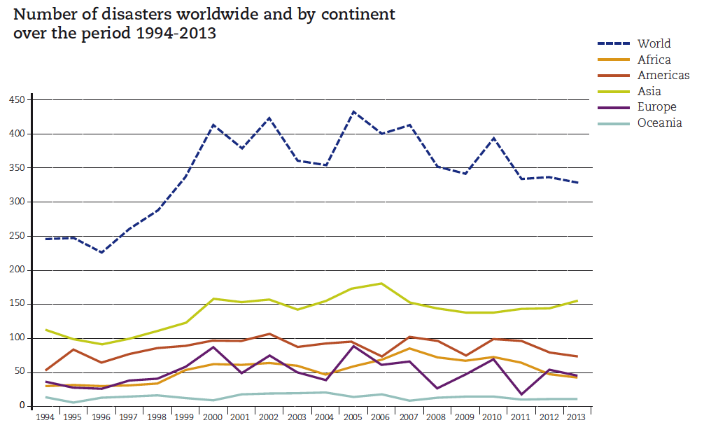 Las inundaciones causaron la mayoría de los desastres (43%) entre 1994 y 2013 y afectaron a unos 2.500 millones de personas. Las tormentas han sido el segundo tipo de desastre más frecuente (28%), mientras que los terremotos (8%, tsunamis incluidos) han matado más gente que el resto de desastres juntos, acabando con la vida de cerca de 750.000 personas en dicho periodo. En total, los 6.873 desastres naturales registrados por el CRED entre 1994 y 2013 causaron 1,35 millones de muertos, una media de 68.000 al año. Las muertes causadas de manera indirecta por los desastres (derivadas de enfermedades, epidemias) no se contabilizan.