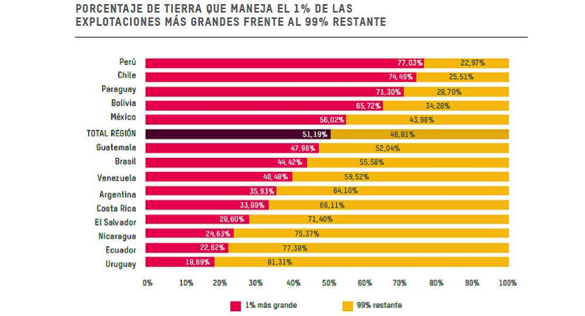 El coeficiente de Gini para la tierra –de 0 a 1, donde 1 representa la máxima desigualdad– es de 0,89 para América del Sur. Un nivel de concentración preocupante, sobre todo cuando lo comparamos con los niveles en Europa (0,57), África (0,56), o Asia (0,55). Otros datos muestran cómo la tierra agrícola se encuentra concentrada en el 1% de las fincas de mayor tamaño. En otras palabras; el 1% de las fincas ocupa más tierra que el 99% restante. El sistema colonial, que giraba en torno a un enriquecimiento basado en el latifundismo y la explotación laboral, parece subsistir hasta nuestros días.