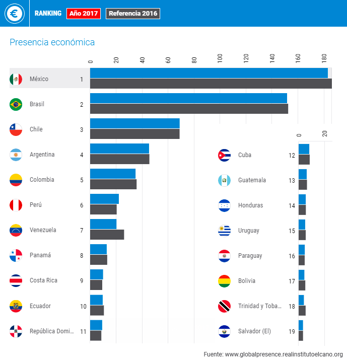 En la edición de 2018 del Índice Elcano de Presencia Global se incorporan cuatro nuevos países de América Latina: Paraguay (puesto 103º en el ranking), Honduras (104º), El Salvador (107º) y Trinidad y Tobago (108º). Con estas incorporaciones, el índice recoge las 19 mayores economías latinoamericanas, cubriendo más del 96% del PIB y del 95% de la población de la región.