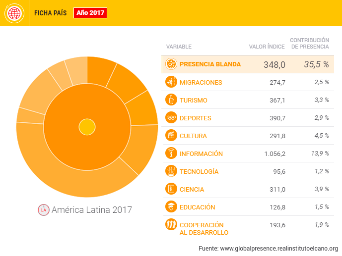 Tal y como hemos comentado, la presencia blanda es el único de los tres ámbitos en el que la presencia internacional de América Latina crece, subiendo 27 puntos en un año.