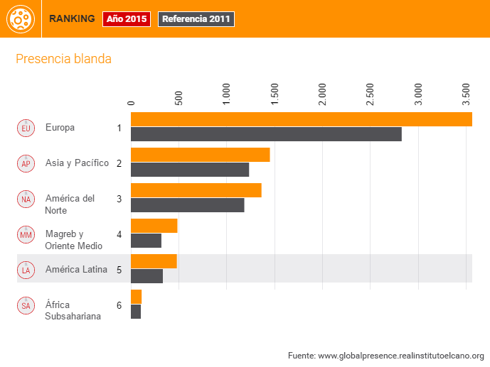 A pesar del elevado peso relativo de su presencia blanda –un 46,8% de su presencia global en 2015, similar a las regiones más desarrolladas (Europa y Norteamérica)–, en términos absolutos la región cae en 2015 al quinto puesto por debajo de Oriente Próximo, tras haberse mantenido en el cuarto desde principios de los noventa. Ello se debe al reducido crecimiento que la presencia blanda de América Latina ha experimentado en el último año (pasando de 478,1 a 479,9 puntos de valor índice) tras cuatro años de importantes subidas que, no obstante, también se han registrado en otras regiones.