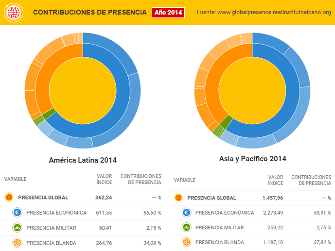 Desde 1990, la presencia económica de Asia y Pacífico se ha multiplicado casi por diez mientras que la de América Latina lo ha hecho por siete. Sin embargo, desde el punto de vista de las bases de proyección exterior de cada una de estas regiones, la economía suponía en 2014 el 65,5% de la presencia de América Latina, más que el 59,9% en el caso de Asia. Frente a la concentración de presencia de América Latina en energía y bienes primarios (20,3% y 27,6%, respectivamente), la asiática se reparte de manera más equitativa, adquiriendo relevancia también manufacturas y servicios. Por tanto, Asia presenta un perfil de presencia económica más diversificado, sinónimo de menor vulnerabilidad externa.