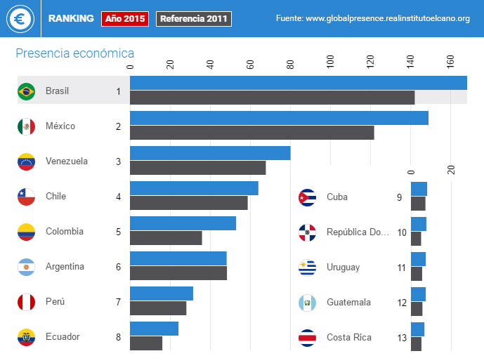 Los países de América Latina tienen en general una baja presencia económica en el mundo. De hecho, en el caso de los dos países con mayor presencia de la región (Brasil y México) su presencia económica es mucho menor que su importancia en términos de PIB. Brasil, séptima economía del mundo, ocupa el puesto 20º en el ranking de presencia económica, mientras que México, la 15ª economía mundial, el 22º.