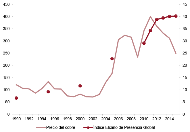 Nota: precio del cobre en eje izquierdo y presencia global en eje derecho. Fuente: Comisión Chilena del Cobre y Real Instituto Elcano, Índice Elcano de Presencia Global