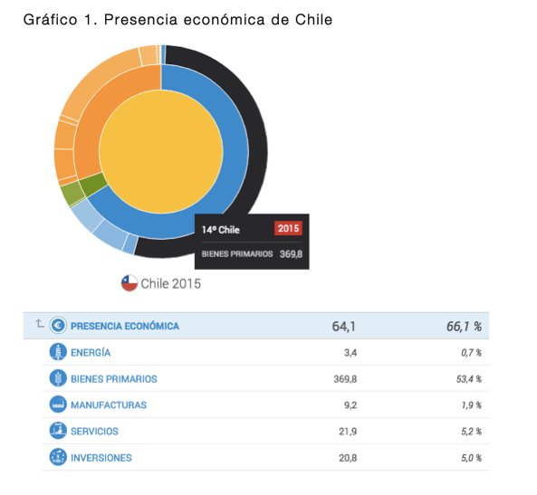 ¿Por qué? Por una parte, Chile ha logrado revertir la caída de la presencia en bienes primarios con aumentos en otras variables o dimensiones como las inversiones (que pasan del 3,7% de la presencia global de Chile en 2012 al 5%), o la información (del 13,0% al 16,0%) y, muy marginalmente, recurriendo al sector turístico (del 4,2% al 4,7%), lo que lo diferencia de las estrategias peruana y dominicana.