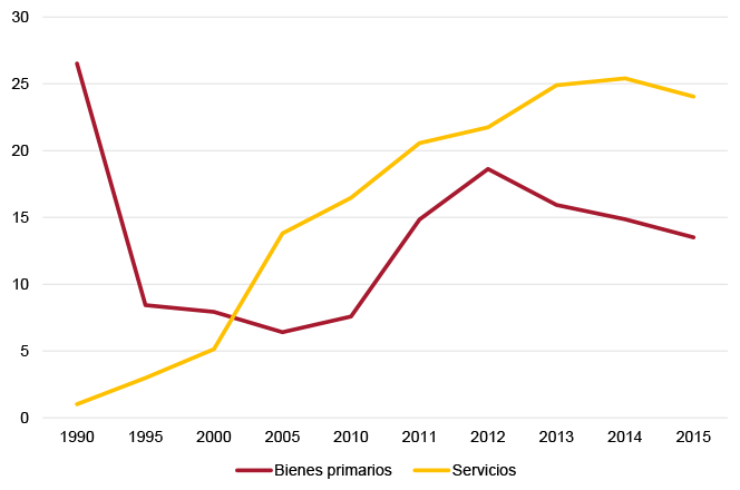Gráfico 2. Presencia en bienes primarios y servicios (selección de variables, en valor índice, 1990-2015)