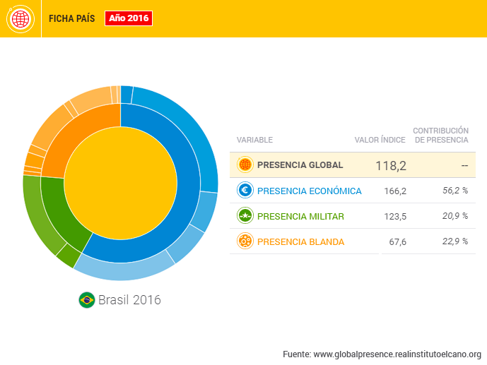 Brasil es la novena economía mundial en PIB y el quinto país en términos de población, lo que le ha permitido ejercer un papel de liderazgo regional mediante diversos procesos políticos y económicos. Sin embargo, si se atiende a la evolución desde comienzos de la década, se aprecia un empeoramiento de sus condiciones económicas. Si en 2011 representaba el 43,1% del PIB latinoamericano y el 3,6% del PIB mundial, dichas proporciones en 2016 eran del 33% y 2,4%, respectivamente. Esta pérdida de posiciones en el contexto internacional tiene su reflejo en el Índice Elcano de Presencia Global, que vendría a mostrar en qué medida y forma se proyectan los países hacia el exterior de sus fronteras. Si desde 2000 Brasil aumentaba de manera sólida su presencia global, a partir de 2013 comienza una tendencia de pérdida de presencia en el mundo. Este índice permite la desagregación de la proyección de un país en tres dimensiones (económica, militar y blanda) que se componen de diversos indicadores. En el caso de Brasil, su presencia en el mundo es fundamentalmente económica (56,2% de su presencia global en 2016).