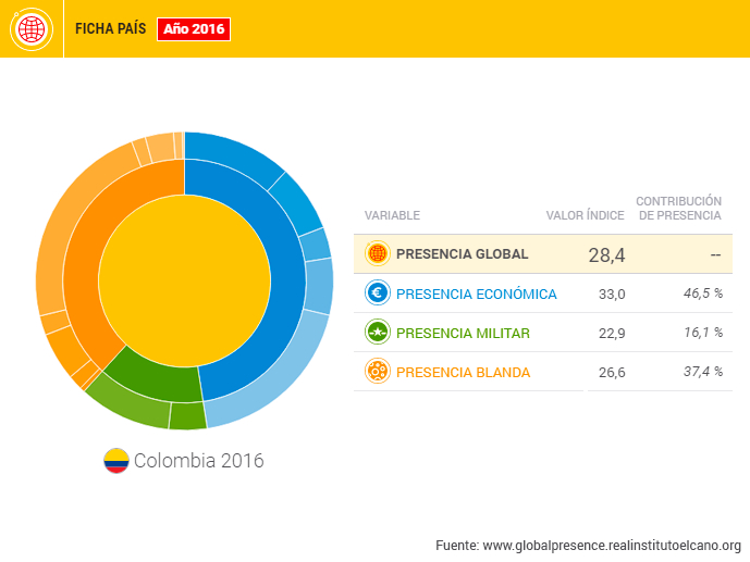 Además de estos países, la Alianza del Pacífico cuenta entre sus filas con una nación, Colombia, que a pesar de tener una fuerte presencia económica (46,5% de su presencia global en 2017), ha visto incrementada su presencia blanda en el mundo, que ha pasado del 16,4% en 2010 al 37,4% en 2016. Este aumento se ha debido sobre todo a la cobertura en los medios de comunicación de Colombia tras el acuerdo de paz con las FARC.