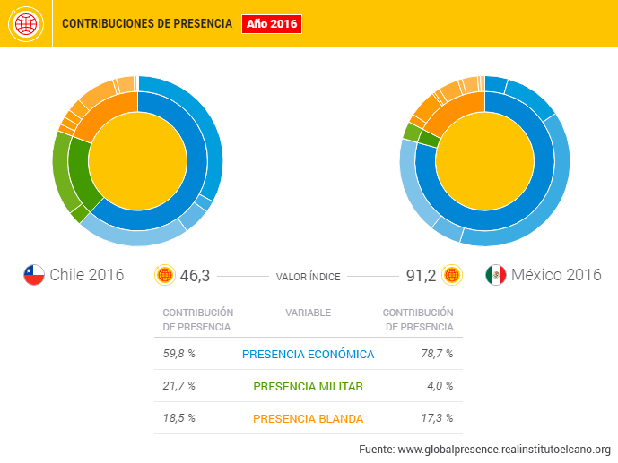 Entre los cuatro países que la forman, destaca en primer lugar México, ubicado en el puesto 23 del Índice de Presencia Global Elcano, con una proyección exterior fuertemente apoyada en su dimensión económica (78,7% de su presencia global en 2017), seguido de Chile en el puesto 34, sobresaliendo también en la dimensión económica (el 59,8% de su presencia exterior). Dada la elevada proyección económica de sus principales miembros, la Alianza del Pacífico pretende ser la punta de lanza de la expansión comercial latinoamericana hacia los mercados asiáticos.
