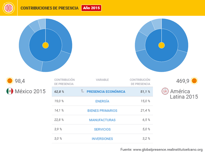 Sirviéndonos de los resultados del Índice Elcano de Presencia Global, hemos argumentado que, en buena medida, América Latina es más pasiva que otras regiones en el proceso de globalización debido a una inserción exterior fuertemente concentrada en lo económico y, en particular, en los bienes primarios y los energéticos; dejando de lado otros aspectos relevantes de las relaciones internacionales (la cultura, la educación o la ciencia) y otras formas de proyección económica (como la producción y exportación de manufacturas y servicios o las inversiones en el exterior).