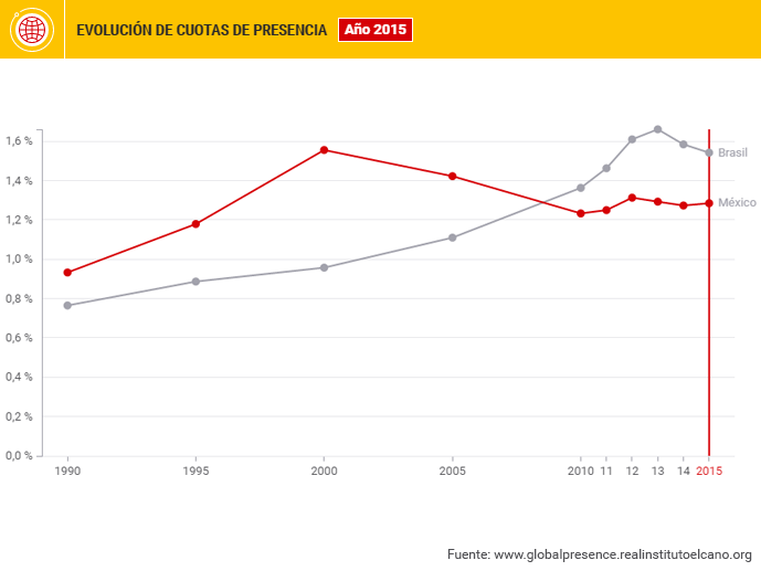 Gráfico 1. Cuota de presencia global, Brasil y México (en % de la presencia global agregada de todos los países)