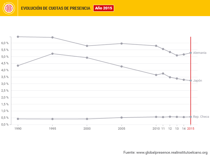 Gráfico 2. Cuota de presencia global, Alemania, Japón y República Checa (en % de la presencia global agregada de todos los países)