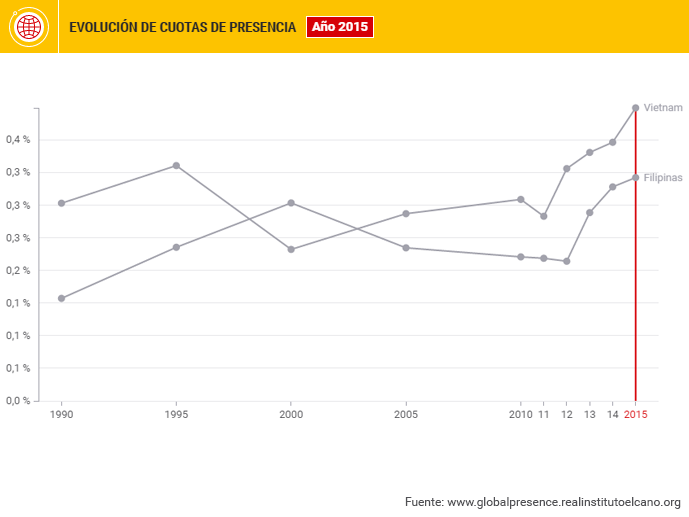Gráfico 3. Cuota de presencia global, Filipinas y Vietnam (en % de la presencia global agregada de todos los países)