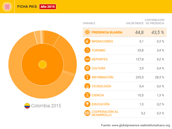 Quizá sea esta dimensión blanda (que recoge indicadores como turismo, migraciones, educación o información, entre otras) la que se haya visto más afectada por el conflicto armado, y quizás, también, la más beneficiada de la resolución del mismo. Con todo, Colombia viene registrando un aumento de presencia blanda (pasa del 7º puesto en el ranking regional de esta dimensión al 4º en la actualidad), empujado en los últimos años por el aumento de menciones en la prensa internacional. No obstante, el bajo peso de esta dimensión y su reparto entre los indicadores dan muestra de un bajo nivel de diversificación que, junto con la concentración primario exportadora ya comentada, son característicos de países en desarrollo o algunos emergentes (en 2015 Colombia ocupa el puesto 97º en el ranking del Índice de Desarrollo Humano).