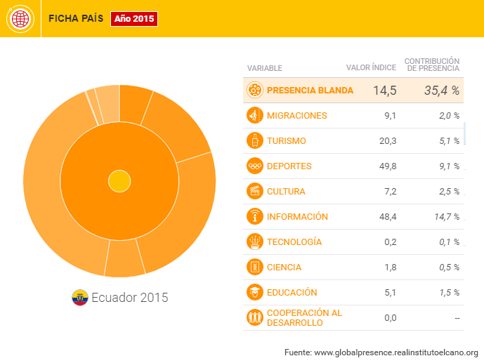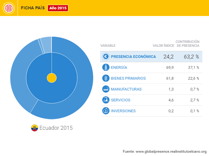 Casi coincidiendo con el periodo de gobierno de Correa, entre 2005 y 2015 la presencia global de Ecuador (medida con el Índice Elcano) se ha duplicado, pasando de 8,2 puntos a 15,9. Este crecimiento es ligeramente superior al que se produce para el conjunto de la región, cuya presencia pasa de 267,4 puntos en 2005 a 469,9 en 2015; lo que se explica con el perfil exportador de la economía ecuatoriana, con unas exportaciones concentradas en unos pocos bienes primarios y energéticos cuyos precios han experimentaron una fuerte subida durante dicho periodo. Así, mientras la presencia económica creció un 156%, la blanda lo hizo menos de un 40% y la militar descendió, produciéndose incrementos por encima de la media en las variables de energía y, sobre todo, bienes primarios (gráfico superior). Fuera por la enfermedad holandesa u otras maldiciones de los recursos naturales, o bien por problemas de diseño en las políticas públicas, la proyección exterior de Ecuador no vendría a reflejar el tan anunciado cambio en la matriz productiva del país.