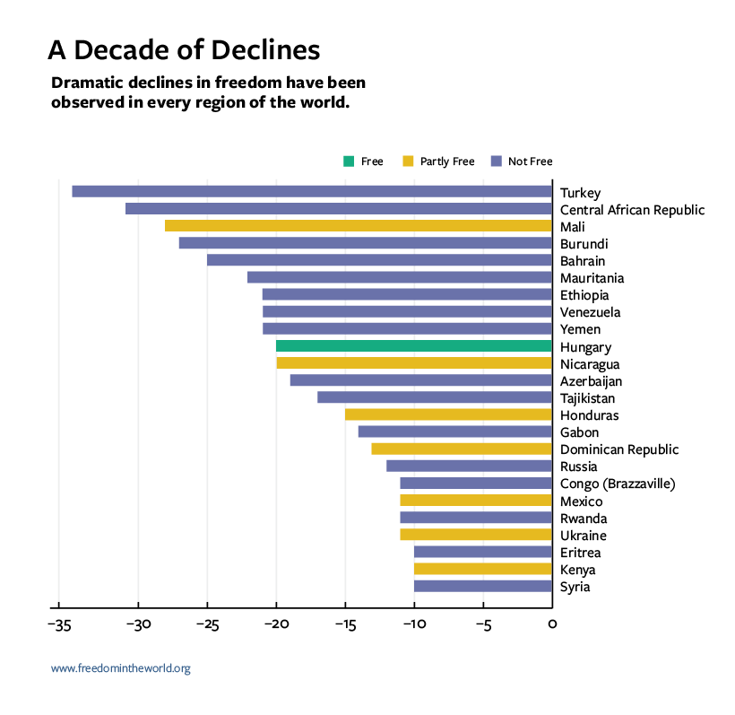 Según este informe, 71 países sufrieron disminuciones netas en derechos políticos y libertades civiles, lo que marca el duodécimo año consecutivo de disminución de la libertad global. El 25% de los países del mundo están clasificados en el rango «no libres», y entre ellos Siria se coloca en el último puesto, con una puntuación de -1 sobre 100. La diferencia con años anteriores radica en que hasta hace poco tiempo, solo los países del Sur tenían dificultades con el cumplimiento de derechos fundamentales; hoy, sin embargo, son los países “ricos”, desde EEUU hasta Europa, pasando por Australia, los que bajan puestos de forma estrepitosa. Incluso EEUU dejó de ser el tradicional campeón y ejemplo de democracia que le otorga esta organización. Según Freedom House, estamos en medio de un declive acelerado de los derechos políticos y las libertades civiles.