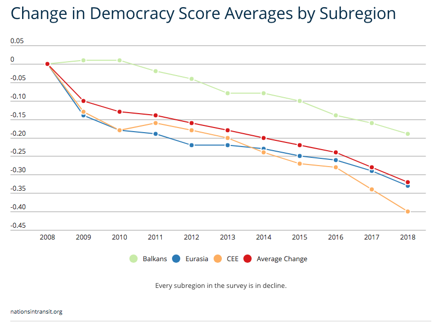 El proyecto Nations in Transit de Freedom House, que rastrea transiciones democráticas en la Europa y Asia poscomunista desde 1995, registró la mayor caída en sus 23 años de historia: 19 de los 29 países tuvieron disminuciones en sus calificaciones generales de democracia. Por segundo año consecutivo, hay más regímenes autoritarios consolidados que democracias.