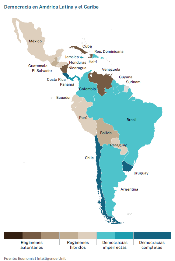Sin embargo, muchos problemas de la democracia aquejan a la región. Los más graves se relacionan con Cuba, Venezuela y Nicaragua, las tres dictaduras del continente. Los acontecimientos recientes en El Salvador y Guatemala, o en Perú, son motivo de preocupación. El surgimiento de líderes de extrema derecha es una novedad que genera serios riesgos. En algunos países no hay democracia o la democracia está en peligro.
