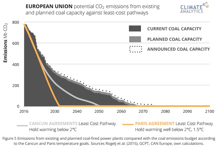 En la Unión Europea hay una creciente disparidad entre los Estados miembros en su enfoque sobre el futuro del carbón. Según recoge un informe de la agencia Climate Analytics, Alemania y Polonia son responsables del 51% de la capacidad instalada de carbón de la UE y del 54% de las emisiones procedentes del carbón. Otros grandes usuarios del carbón en términos de capacidad de emisión son República Checa, España, Italia y Reino Unido. Es necesario hacer reformas eficaces al respecto, pues se estima que si se mantiene el statu quo, las emisiones de CO2 habrán aumentado un 85% en 2050. El cierre definitivo de las centrales termoeléctricas de carbón es un objetivo fundamental. Sin embargo, prescindir prematuramente de determinadas tecnologías o combustibles, significaría poner en riesgo la eficiencia económica.
