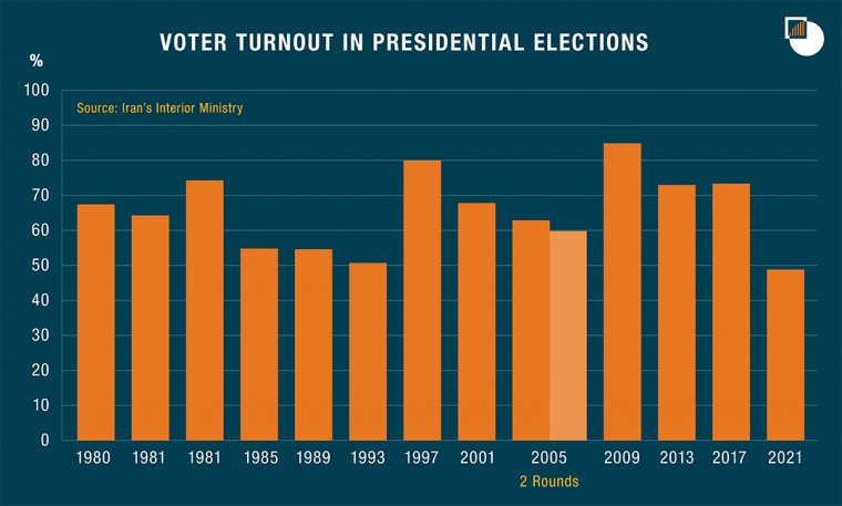 El fenómeno no es nuevo en la República Islámica. De hecho, todas las elecciones celebradas desde mediados de la década de los ochenta hasta mediados de la década de los noventa se caracterizaron por una contención similar y una baja participación. Por ejemplo, antes de que se convirtiera en líder supremo, Jamenei fue reelegido como presidente en 1985 en una contienda con dos rivales que no le plantearon ningún reto serio, obteniendo el 85% de los votos con una participación de solo el 54%. Su sucesor, Alí Akbar Hashemi Rafsanjani, se convirtió en presidente en 1989 en una carrera de dos hombres donde su victoria fue casi segura (ganó con el 94% de los votos) con una tasa de participación también del 54%. Estos aburridos asuntos contrastan fuertemente con las sorprendentes victorias del presidente Jatamí en 1997 y del Rohaní en 2013, que registraron una participación del 80% y del 73%, respectivamente.