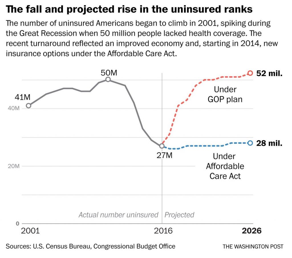 La Oficina Presupuestaria del Congreso, órgano independiente creado en 1974 para superar las falsedades estadísticas del ejecutivo, señaló que su implementación supondría inmediatamente la pérdida del seguro a 14 millones de ciudadanos y de 24 millones en los años sucesivos, al elevar considerablemente las primas. Al mismo tiempo, esto originaría un enorme crecimiento del déficit por la pérdida del rédito fiscal que implica, favoreciendo a las clases más adineradas a costa del resto, y rindiendo un superávit presupuestario que provendría simplemente de la eliminación de una buena parte de lo que el Estado aporta para Medicaid, el seguro de los pobres, considerablemente extendido por Obamacare.