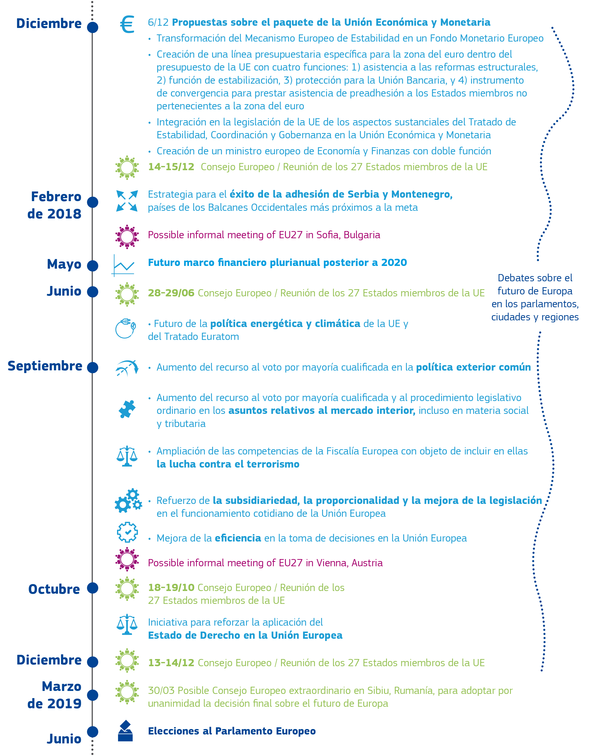 El mensaje ciudadano, alejado del apocalipsis, ha sido claro, como resume el líder liberal Guy Verforstadt: reformar Europa y no destruirla. Para ello Juncker presentó en marzo su libro blanco, con cinco escenarios posibles para el futuro de la UE a 27, es decir, la Unión que nacerá tras la salida británica el 31 de marzo de 2019. Tras meses especulando sobre el camino variable y a la carta, con repliegue incluido, al que la UE parecía destinada tras su peor crisis, Juncker apuesta por la receta de siempre: más Unión Europea, más integración y más camino lento, eterno, incierto, pero camino al fin y al cabo, para una Europa federal.