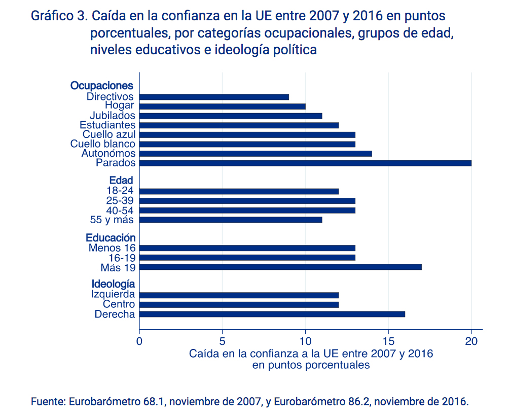 La caída de confianza hacia la UE es un fenómeno transversal: ningún grupo social se salva de ella. Según el Informe Elcano son tres los factores que pueden estar asociados a la visión de estos individuos: el cosmopolitismo, la percepción de impotencia democrática y la vulneración económica.